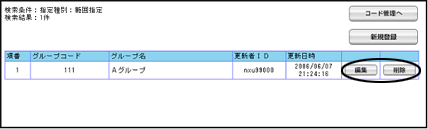 この画面では、グループコードの新規登録、登録済コード検索及び登録内容の変更・削除を行うことができます。なお画面遷移時には、現在登録されているコードが全て一覧表示されます。